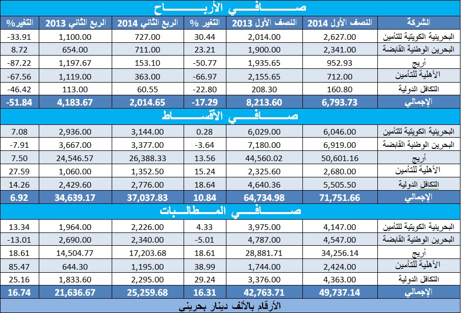 سجل صافي المطالبات بقطاع التأمين البحريني نموا أكبر من صافي الأقساط بالنصف الأول من عام 2014، ليهبط بصافي الأرباح الإجمالية لشركات القطاع خلال تلك الفترة.