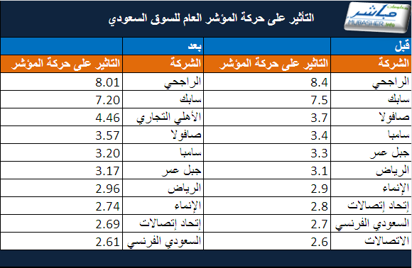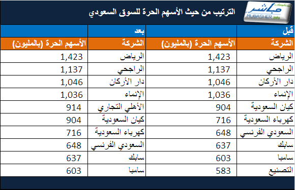 أما في الأسهم الحرة فسوف يقوم الأهلي التجاري بالظهور في المرتبة الخامسة لتخرج بذلك شركة التصنيع الوطنية من قائمة العشرة الكبار.