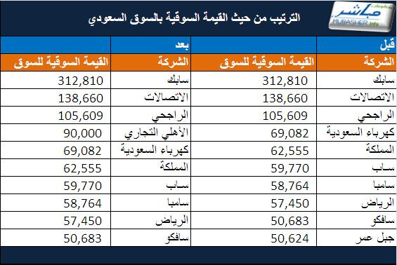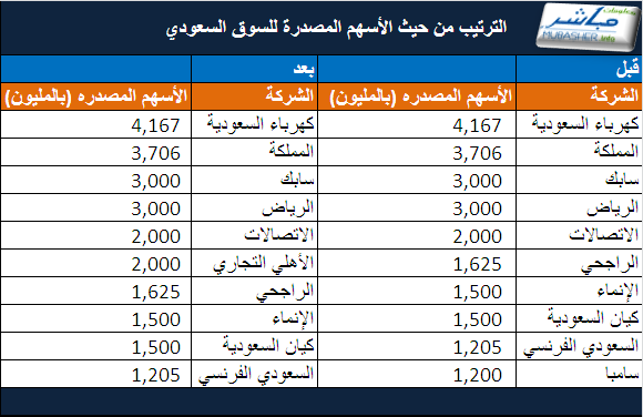 وفي الأسهم المصدرة ستخرج مجموعة سامبا من قائمة العشرة الكبار بعد دخول الأهلي التجاري ومشاركته للاتصالات السعودية في المرتبة الخامسة.