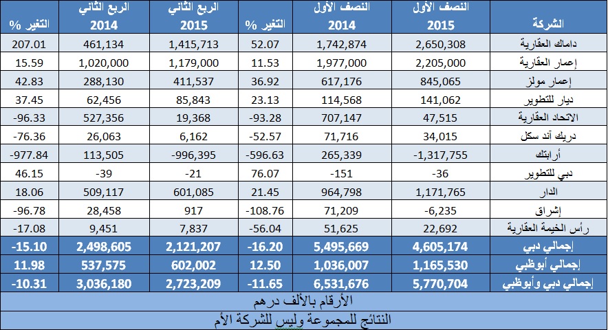 وعلى مستوى الربع الثاني، سجلت شركات العقار المدرجة بالإمارات صافي أرباح بلغ 2.12 مليار درهم مقابل حوالي 2.5 مليار درهم للربع الثاني من 2014 بنسبة تراجع بلغت 15%.