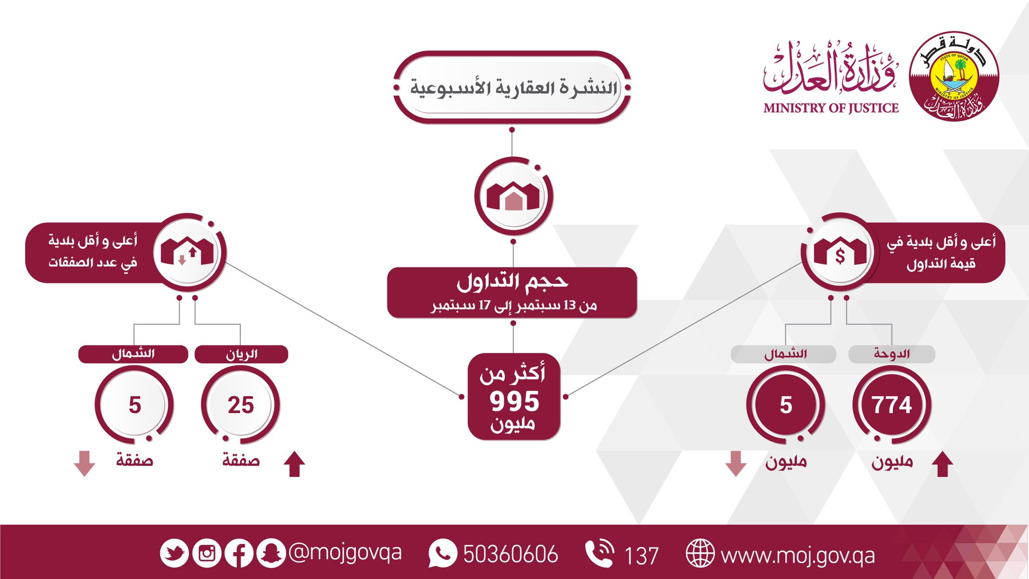 الدوحة – مباشر: سجلت تداولات العقارات في دولة قطر خلال الفترة من 13 إلى 17 سبتمبر/ أيلول الجاري أكثر من 995.86 مليون ريال.