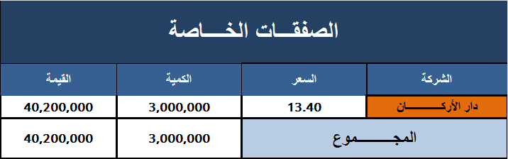 تم تنفيذ صفقة خاصة بالسوق السعودية اليوم الخميس 25 سبتمبر 2014 م لـ "دار الأركان للتطوير العقاري" بقيمة بلغت 40,200,000.00 ريال.