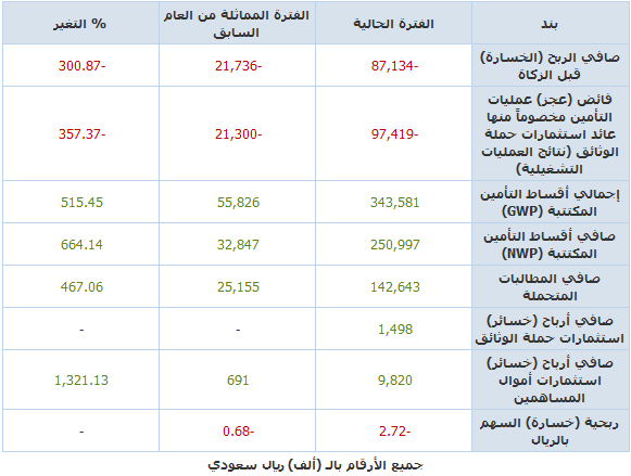 وأرجعت الشركة أن يعود سبب الإرتفاع في صافي الخسائر خلال الربع الحالي مقارنة بالربع المماثل من العام السابق إلى قيام الشركة بتسجيل الاحتياطيات الفنية بحسب تقرير الخبير الاكتواري كما بتاريخ 2014/9/30 وإلى الزيادة في حجم المطالبات المتكبدة نتيجة الزيادة في إجمالي الأقساط المكتتبة بالإضافة إلى الزيادة في صافي تكاليف اكتتاب وثائق التأمين وارتفاع المصاريف الإدارية.