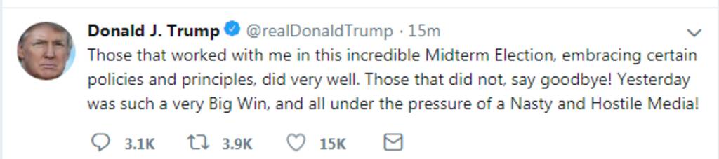 وقال ترامب عبر حسابه على موقع "تويتر"، اليوم الأربعاء: "إلى هؤلاء الذين عملوا معي في تلك الانتخابات النصفية الرائعة التي تبنت سياسات ومبادئ معينة، لقد أديتوا عملاً جيداً للغاية".