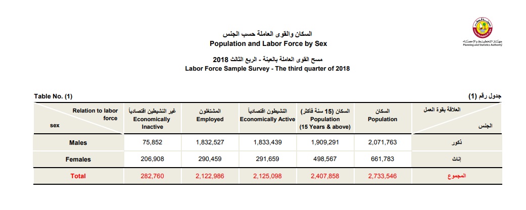 وارتفع إجمالي السكان في قطر إلى 2.733 مليون نسمة بنهاية الربع الثالث، بزيادة 126 ألف نسمة عن الربع الثاني 2018.