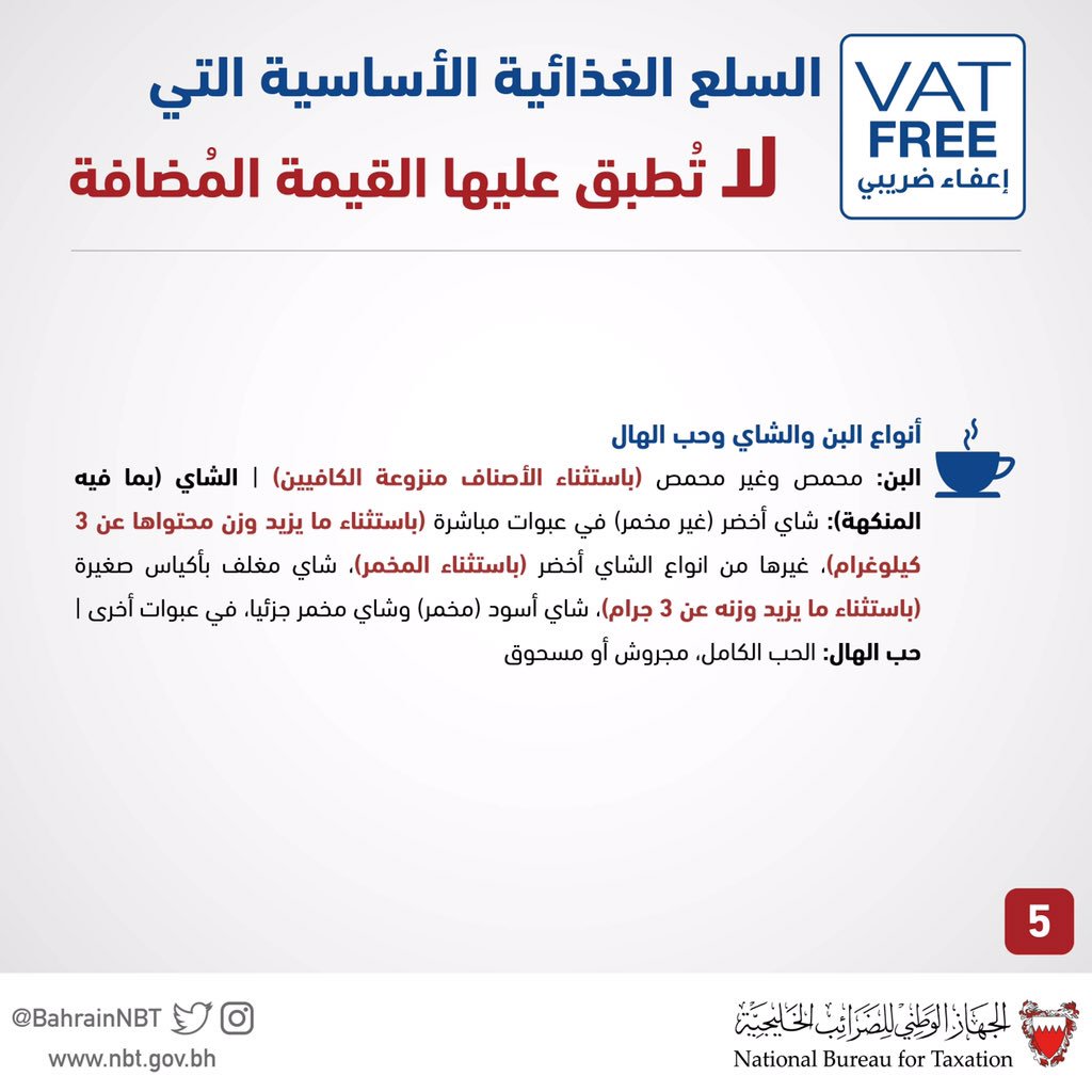 ومن بين السلع المعفاة من تطبيق القيمة المضافة في البحرين الخضراوات والفواكه، وأنواع البن والشاي، إلى جانب منتجات الألبان، والمياه، والخبز، واللحوم والأسماك والدجاج.