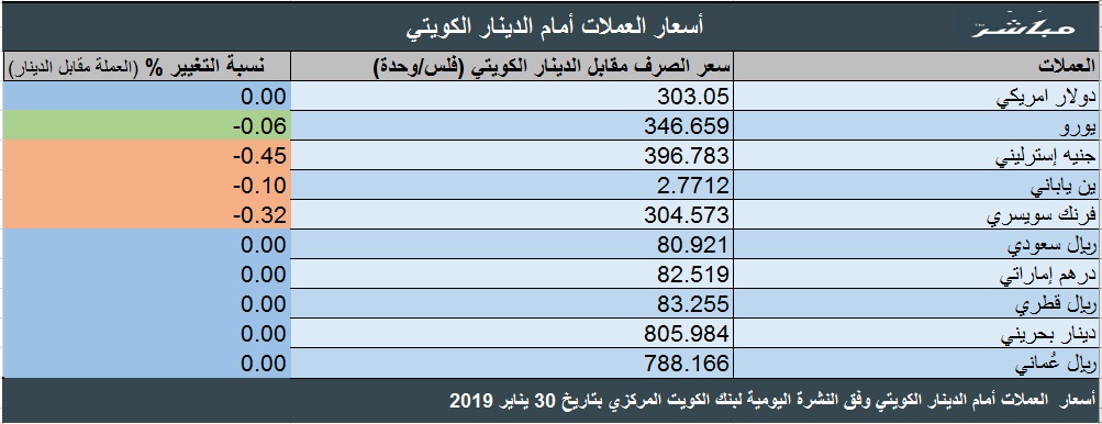 وفيما يلي جدول يعرض أسعار صرف أبرز العملات العربية والأجنبية، مقابل الدينار الكويتي، وذلك وفق بيانات بنك الكويت المركزي: