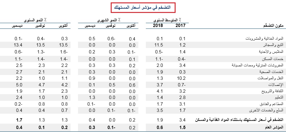 ونوه بأن متوسط معدل التضخم تراجع من 1.5% في 2017 إلى 0.6% فقط إجمالاً في 2018؛ وهو أدنى معدل له منذ 2002، الذي يرجع غالباً إلى ضعف الضغوطات السعرية في قطاعي الغذاء والسكن.