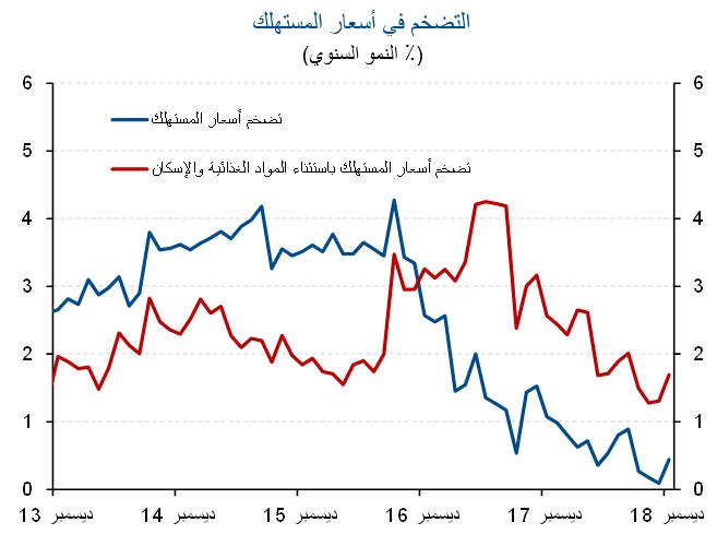 وأشار التقرير إلى بقاء التضخم منخفضاً في الربع الرابع من 2018، حيث ارتفع بشكل طفيف فقط من 0.3% في سبتمبر إلى 0.4% بنهاية الربع الرابع على أساس سنوي، بعد أن بلغ أدنى مستوى له في 15 سنة عند 0.1% فقط في نوفمبر الماضي.