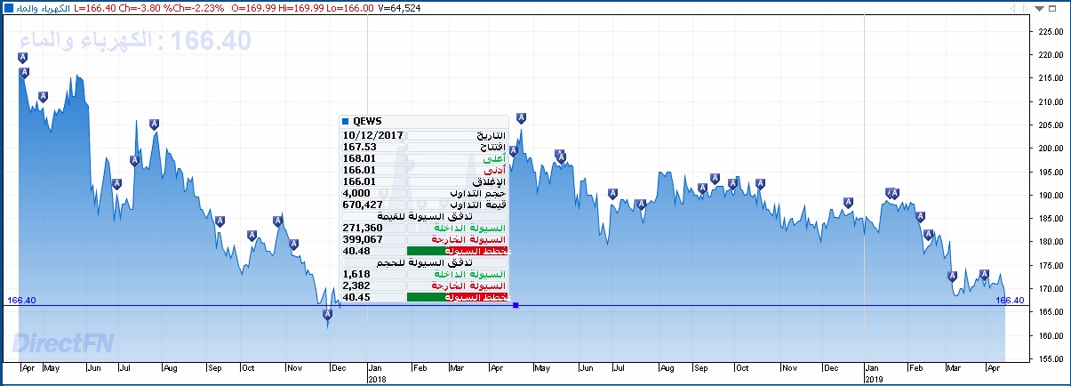 الدوحة – مباشر: تراجع سهم شركة الكهرباء والماء القطرية، المدرج ببورصة قطر خلال تعاملات اليوم الاثنين، لأدنى مستوى منذ ديسمبر 2017 (16 شهراً)، تجاوباً مع القوائم المالية المعلنة للربع الأول من 2019.