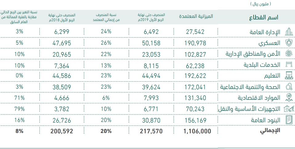 وبلغت نسبة الإنفاق بالميزانية العامة للمملكة العربية السعودية خلال الربع الأول من العام المالي 2019 نحو 20 بالمائة، من إجمالي الإنفاق الذي أعلنت عنه الحكومة بمشروع الميزانية للعام بالكامل، والذي بلغ 1.106 تريليون ريال كأكبر مخصص للمصروفات تم الإعلان عنه بمشروع ميزانية في المملكة.