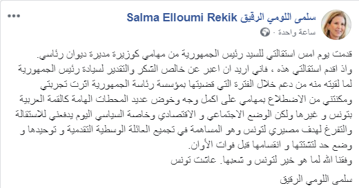 ولفتت سلمى اللومي عبر حسابها الرسمي على الفيس بوك، إلى أنها قدمت يوم الثلاثاء استقالتها، لرئيس الجمهورية من مهامها كمديرة ديوان الرئاسة.