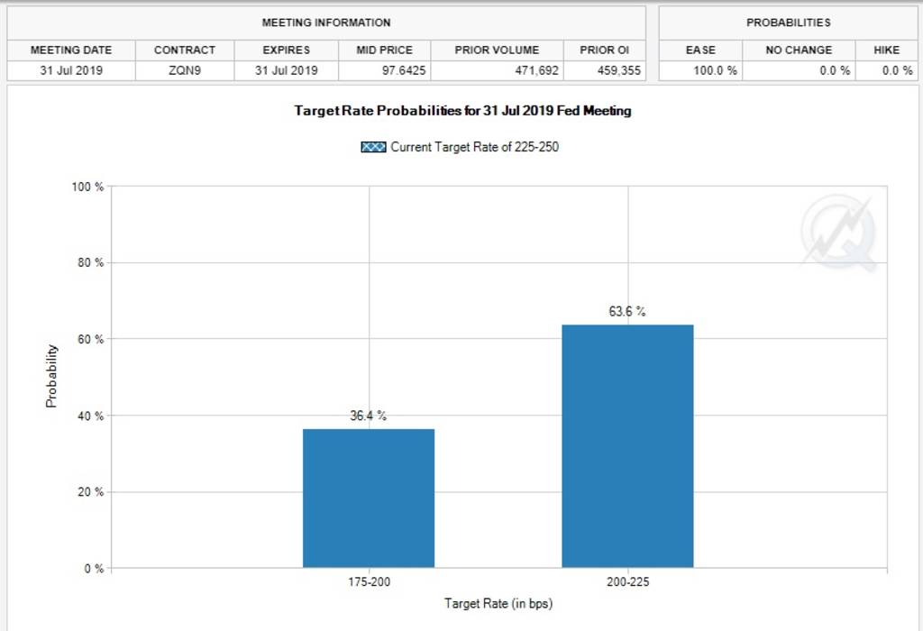 ويضع المستثمرون فرصة بنحو 64 بالمائة لخفض معدل الفائدة 0.25 بالمائة في الاجتماع القادم لتتراوح بين 2.00 إلى 2.25 بالمائة في مقابل احتمال بنحو 36 بالمائة لخفضها 0.50 بالمائة.