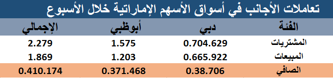 ووصلت قيمة العمليات الشرائية في كلا السوقين (دبي وأبوظبي) إلى نحو 2.279 مليار درهم، مقابل مبيعات سجلت قيمة قدرها 1.869 مليار درهم.