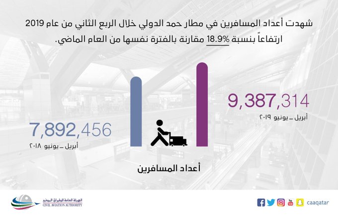 وكان عدد المسافرين عبر مطار حمد الدولي ارتفع خلال الربع الأول من العام الجاري بنسبة 5.04بالمائة إلى 9.16 مليون مسافر، مقابل 8.72 مليون مسافر في الربع الأول من 2018.