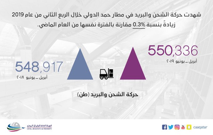 وأشارت البيانات إلى ارتفاع حركة الشحن والبريد في مطار حمد الدولي بنسبة 0.3 بالمائة، إذ تم تسجيل 550.34 ألف حركة شحن، مقابل 548.92 ألف حركة شحن بالفترة المناظرة من العام السابق.