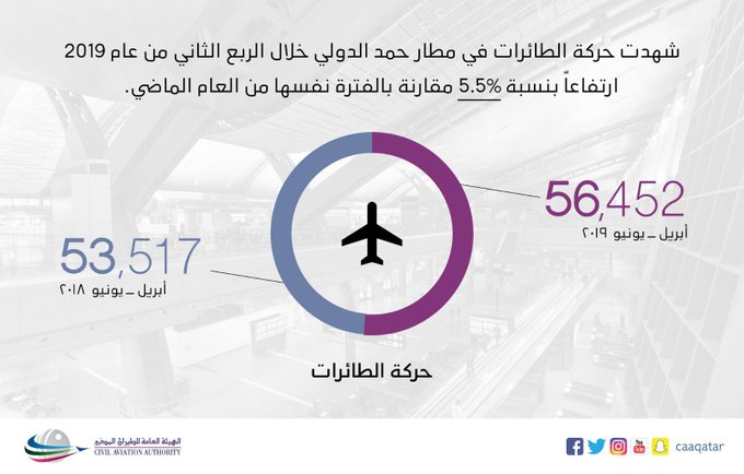 وسجلت حركة الطائرات في مطار حمد الدولي خلال الربع الثاني من 2019 ارتفاعاً بلغ بـ5.5 بالمائة إلى 56.45 ألف حركة، مقارنة بـ53.52 ألف حركة في نفس الفترة من 2018.