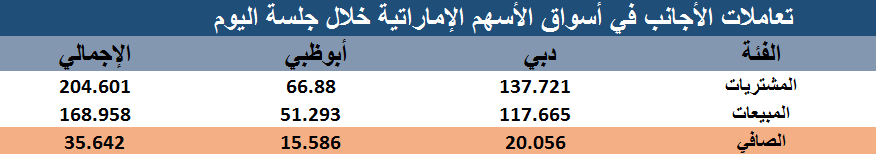 وفي المجمل، نفذ المستثمرون الأجانب عمليات بيع على أسهم دبي وأبوظبي بقيمة قدرها 168.958 مليون درهم، مقابل مشتريات ارتفعت قيمتها مسجلة 204.601 مليون درهم.