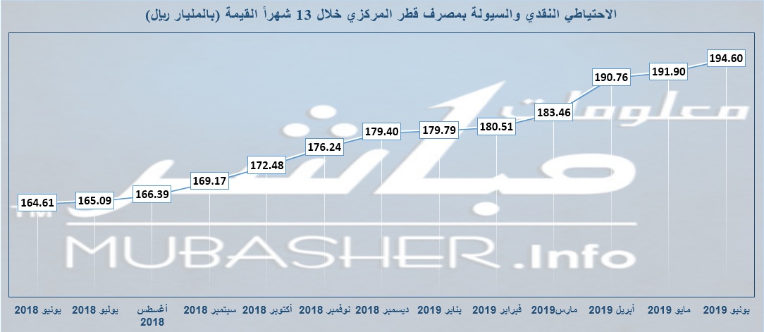 وسجل الاحتياطي النقدي والسيولة لقطر في الشهر الماضي 194.60 مليار ريال (54.45 مليار دولار)، مقابل 164.61 مليار ريال (46.06 مليار دولار) في يونيو/ حزيران 2018.