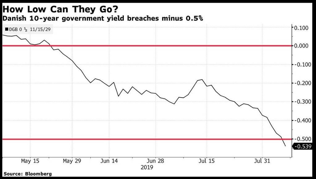 وتراجع العائد على السندات الحكومية في الدنمارك لمستوى - 0.5 بالمائة، أي أن المستثمرون سيدفعون مقابل امتياز حيازة الديون.