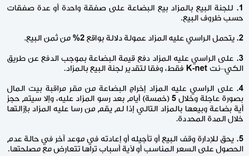 وذكرت الإدارة في البيان أنه على الراغبين في الشراء الحضور إلى موقع المزاد في التاريخ المُحدد مع مراعاة شروط البيع التالية: