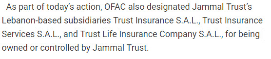 وصرحت وزارة الخزانة: " تستهدف جمال ترست بنك وشركاته التابعة لتمكينه للأنشطة المالية لجزب الله، تشكل المؤسسات المالية الفاسدة مثل جمال ترست تهديداً مباشراً لسلامة النظام المالي اللبناني".