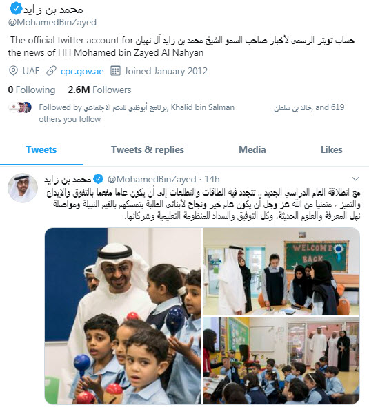 وغرد "بن زايد" على صفحته الرسمية بـ"تويتر"، متمنيا من الله عز وجل أن يكون عام خير ونجاح لأبنائي الطلبة بتمسكهم بالقيم النبيلة ومواصلة نهل المعرفة والعلوم الحديثة، وكل التوفيق والسداد للمنظومة التعليمية وشركائها.