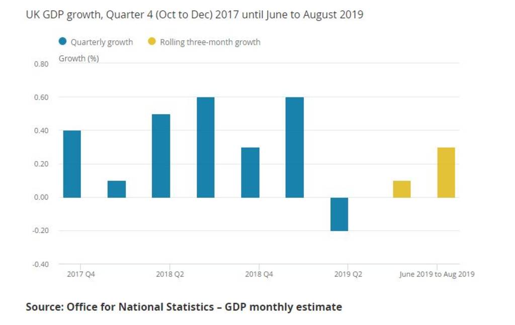 وعلى أساس الأداء الفصلي للثلاثة أشهر المنتهية في أغسطس/آب، فإن اقتصاد بريطانيا نما بنسبة 0.3 بالمائة مقارنة مع ارتفاع 0.1 بالمائة في الفترة من مايو/آيار وحتى يوليو/تموز.