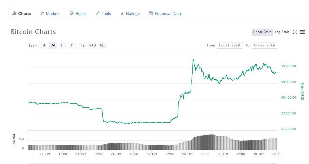وبحلول الساعة 10:36 صباحاً بتوقيت جرينتش، ارتفعت عملة البيتكوين بنسبة 0.7 بالمائة لتصل إلى 9401.7 دولار، وفقاً لبيانات منصة "كوين ماركت كاب".
