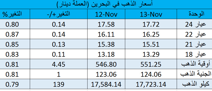 ويشير الجدول التالي إلى سعر الذهب في مملكة البحرين بين اليوم ويوم أمس.