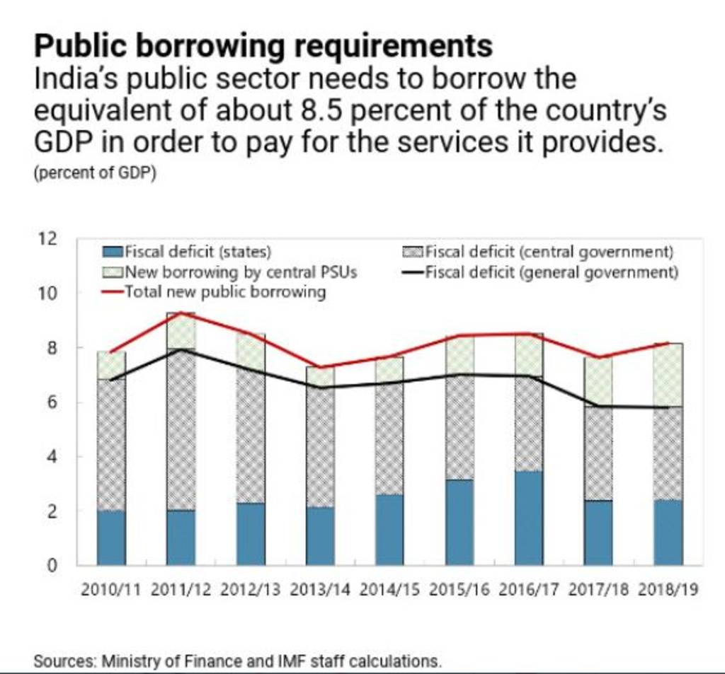 وأوصى صندوق النقد الهند بضرورة تبني إجراءات من شأنها تقليل الديون إلى المستوى المستهدف رسمياً والبالغ 60 بالمائة من الناتج المحلي الإجمالي.