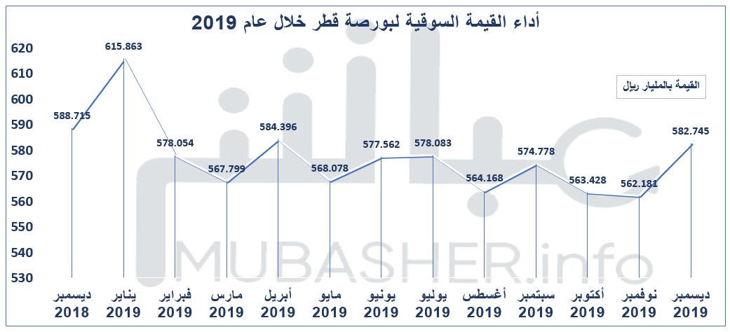وبلغت القيمة السوقية للأسهم القطرية أعلى مستوى لها خلال العام الماضي في شهر يناير/ كانون الثاني بقيمة 615.863 مليار ريال، فيما وصلت لأدنى مستوى بنوفمبر/ تشرين الثاني السابق البالغ 562.181 مليار ريال.
