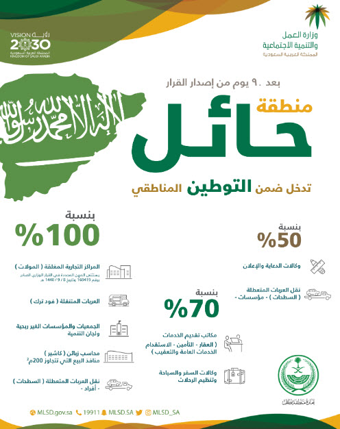 الرياض - مباشر: أصدر وزير العمل والتنمية الاجتماعية السعودي، قراراً وزارياً يقضي بتوطين عدد من الأنشطة والمهن في منطقة حائل بنسب تتراوح ما بين 50 إلى 100 في المئة.