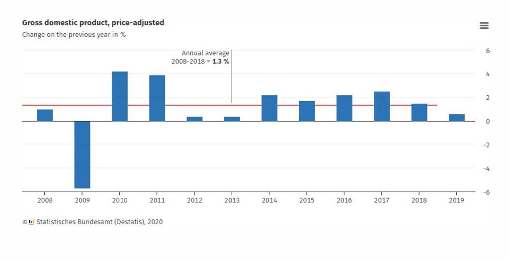 وكشفت بيانات صادرة عن هيئة الإحصاءات الفيدرالية في ألمانيا، اليوم الأربعاء، أن الناتج المحلي الإجمالي في البلاد نما بنسبة 0.6 بالمائة خلال عام 2019 وهي أقل وتيرة نمو منذ عام 2013 عندما شهد الاقتصاد توسعاً بنحو 0.4 بالمائة.