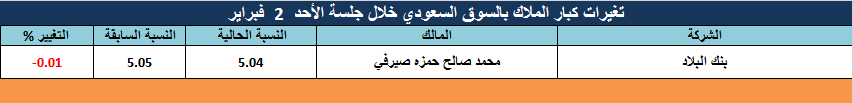 الرياض - مباشر: شهد سوق المال السعودي " تداول" تغير وحيد بحصص كبار الملاك في الشركات المدرجة، وذلك خلال تسوية تعاملات جلسة الأحد الموافق 2 فبراير/ شباط الجاري.