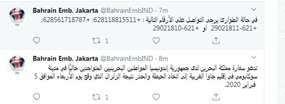 وطالبت السفارة البحرينية، المواطنين المتواجدين في إندونيسيا التواصل معها في أي حالة طارئة.