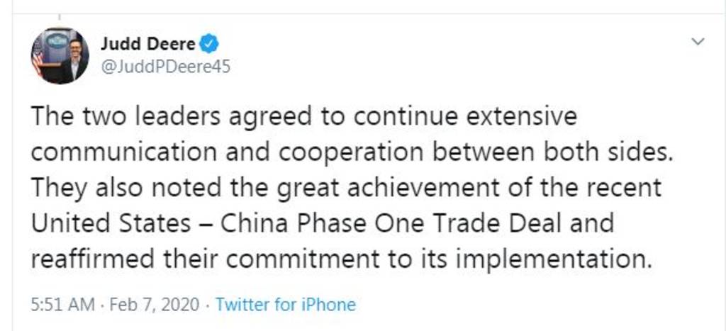 وكان المتحدث باسم البيت الأبيض "جود دير" ذكر في وقت مبكر من اليوم أن رئيسي الولايات المتحدة والصين عقدا مكالمة عبر الهاتف لمناقشة مأزق تفشي الفيروس الجديد الذي اندلع في 2019.