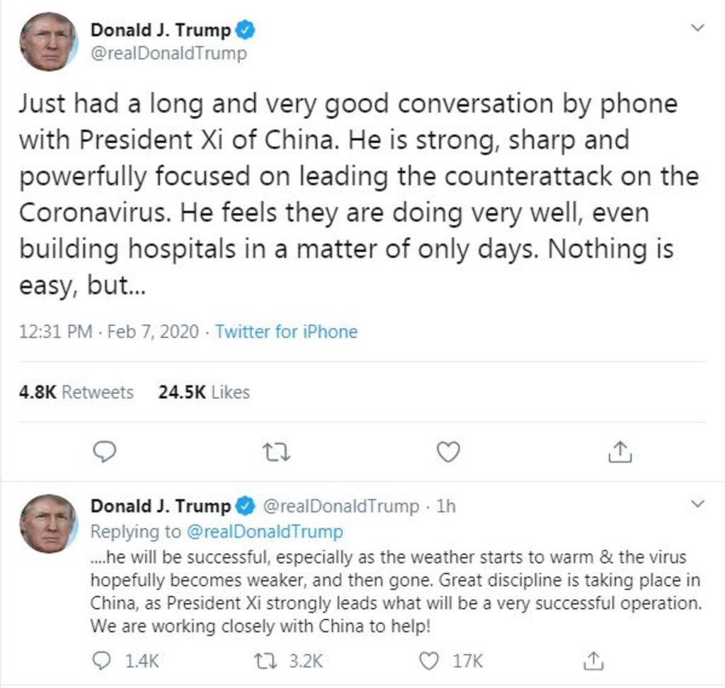 وأوضح الرئيس الأمريكي أن نظيره الصيني يركز بقوة وصرامة على مواجهة فيروس كورونا، قائلاً إنه يشعر أنهم في حالة جيدة للغاية حتى أن بناء المستشفيات تم في غضون أيام فقط.
