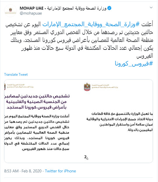 وقالت وزارة الصحة في تغريدة على حسابها الرسمي بموقع التواصل الاجتماعي "تويتر"، اليوم، إنه بعد تشخيص الحالتين الجديدتين يصل إجمالي عدد الحالات المكتشفة في الدولة 7 حالات منذ ظهور الفيروس في الصين.