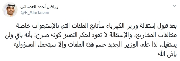 وقال النائب العدساني في تغريدة على حسابه الرسمي بتويتر اليوم، إنه وبعد قبول استقالة وزير الكهرباء سأتابع الملفات التي بالاستجواب خاصة مخالفات المشاريع.