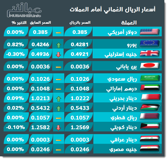 وارتفع اليورو 0.82 بالمائة، أمام العملة العُمانية، في الساعة 3:50 صباحًا بتوقيت جرينتش، وتراجع الجنيه الإسترليني 0.3 بالمائة.