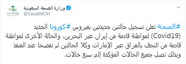 وأوضحت الوزارة عبر حسابها الرسمي على "تويتر"، اليوم السبت، أن أحد الحالتين قادمة من إيران عبر مملكة البحرين ولم تفصح عند المنفذ السعودي عن تواجدها في إيران، والثانية لمواطنة أخرى قادمة من النجف بالعراق عن طريق الإمارات ولم تفصح عن ذلك عند المنفذ.