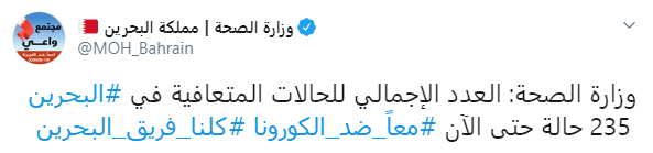 مباشر: أعلنت وزارة الصحة البحرينية عن تعافي 8 حالات إضافية من فيروس كورونا المستجد (COVID-19)، وإخراجهم من مركز العزل والعلاج.