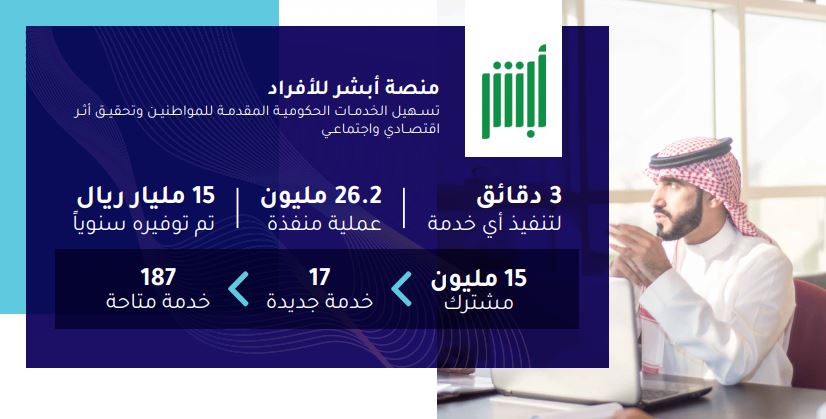 وأظهر التقرير إنجازات المملكة في جميع القطاعات أبرزها في قطاع الحكومة الذكية، والذي شهد تنفيذ أكثر من 26 مليون عملية على منصة "أبشر" بوفر مالي يقدر بـ 15 مليار ريال سنوياً، وأكثر من 44 مليون عملية تم تنفيذها في خدمة "النفاذ الوطني الموحد".