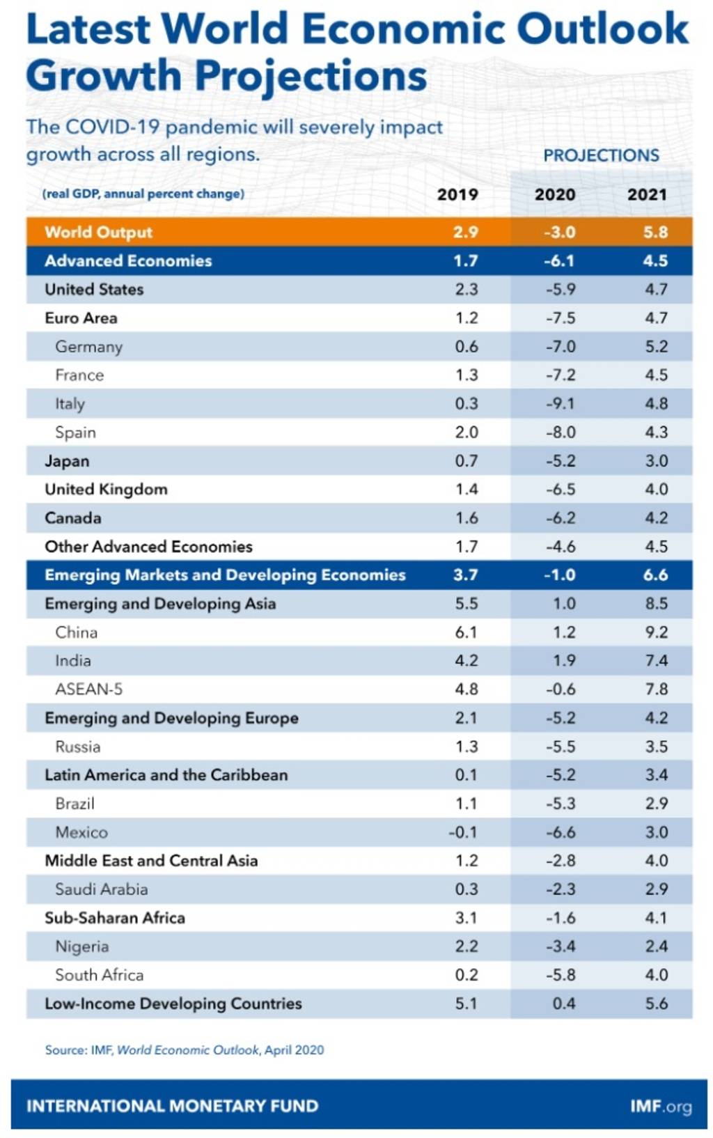 وأوضح تقرير الربيع لصندوق النقد حول التوقعات المستقبلية بشأن الاقتصاد والصادر اليوم الثلاثاء، أنه من المتوقع أن ينكمش الناتج المحلي الإجمالي العالمي بنحو 3 بالمائة خلال عام 2020، وهي قراءة أسوأ من المسجلة في الأزمة المالية عامي 2008 و2009.