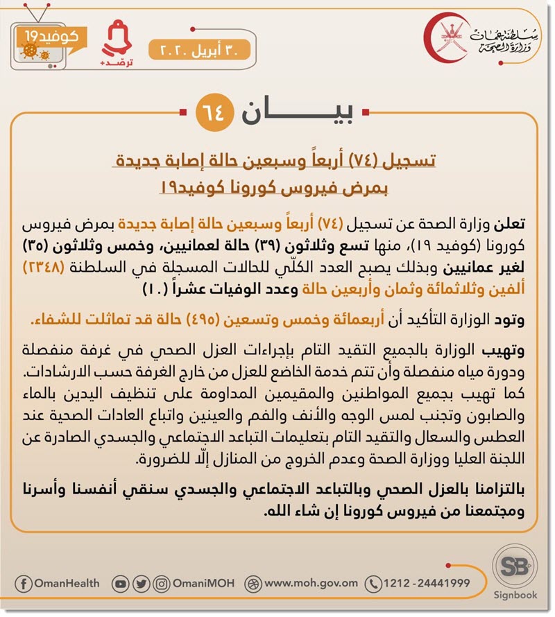 مباشر: أعلنت وزارة الصحة في سلطنة عُمان عن تسجيل 74 حالة إصابة جديدة بفيروس كورونا "19-Covid".