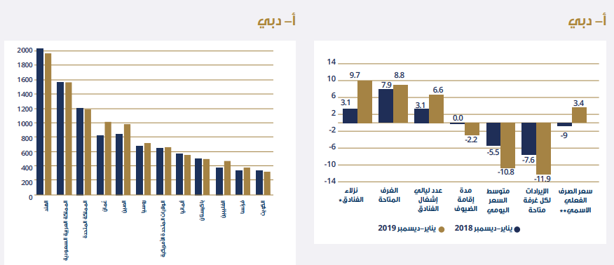 وأشار التقرير إلى أن عدد نزلاء الفنادق من الأجانب في دبي استمر في النمو، وكان معدل الإشغال مدعوماً بخصومات للاستفادة من طاقة الفنادق الحالية، ونتيجة لذلك انخفضت الإيرادات لكل غرفة متاحة بشكل ملحوظ بنسبة 12 بالمائة، مقارنة بعام 2018.