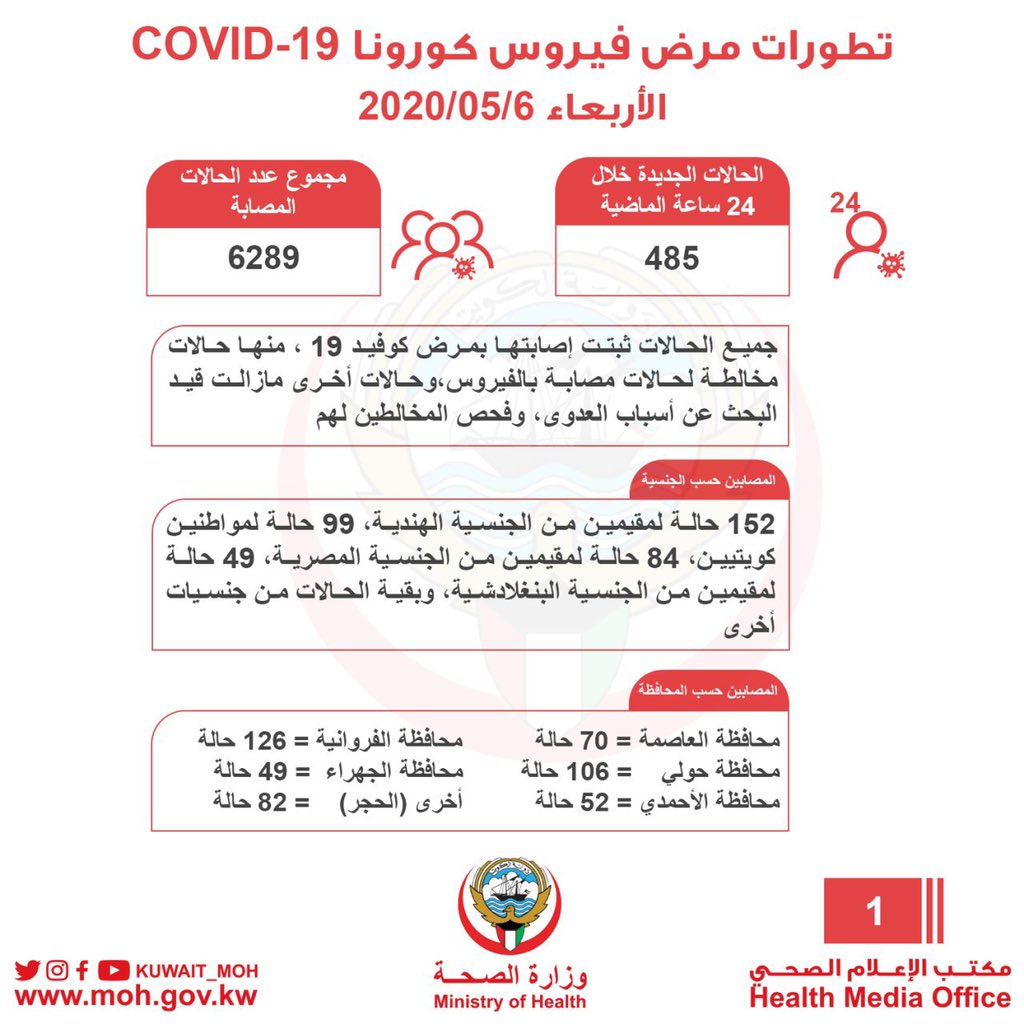 الكويت - مباشر: أعلنت وزارة الصحة الكويتية، اليوم الأربعاء، عن تسجيل 485 حالة جديدة مؤكد إصابتها بفيروس كورونا (كوفيد-19).