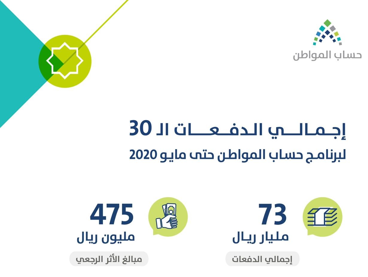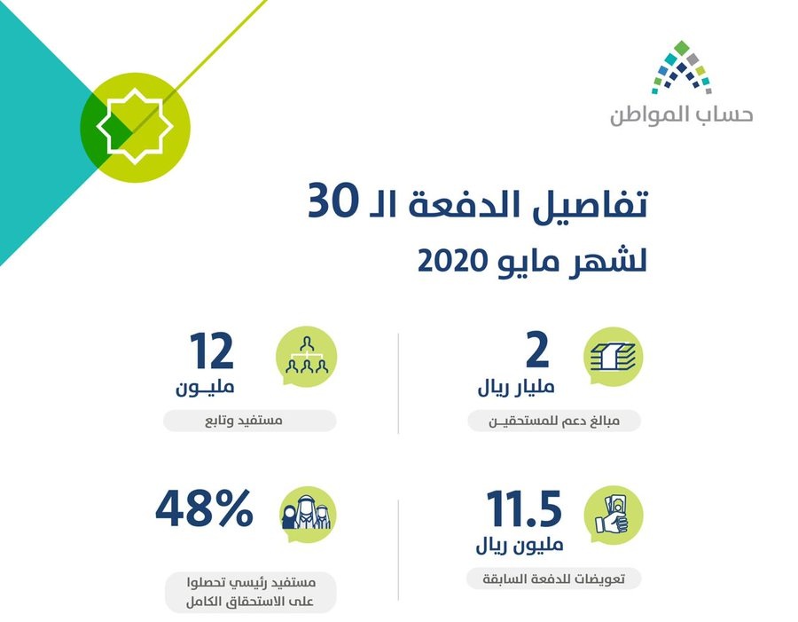 الرياض - مباشر: أعلن برنامج حساب المواطن، لدعم المواطنين السعوديين، عن تفاصيل الدفعة 30 من الدعم المخصص للمستفيدين عن شهر مايو / أيار 2020.