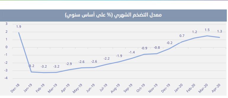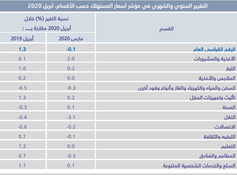 وعلى أساس شهري، انخفض معدل التضخم 0.1% مقارنة مع شهر مارس/ آذار 2020؛ متأثراً بتراجع متوسط الأسعار في قسم النقل بنسبة 3.1%، وقسم المطاعم والفنادق 0.3%، وقسم السكن والمياه والكهرباء والغاز ووقود أخرى بنحو 0.3% كذلك.